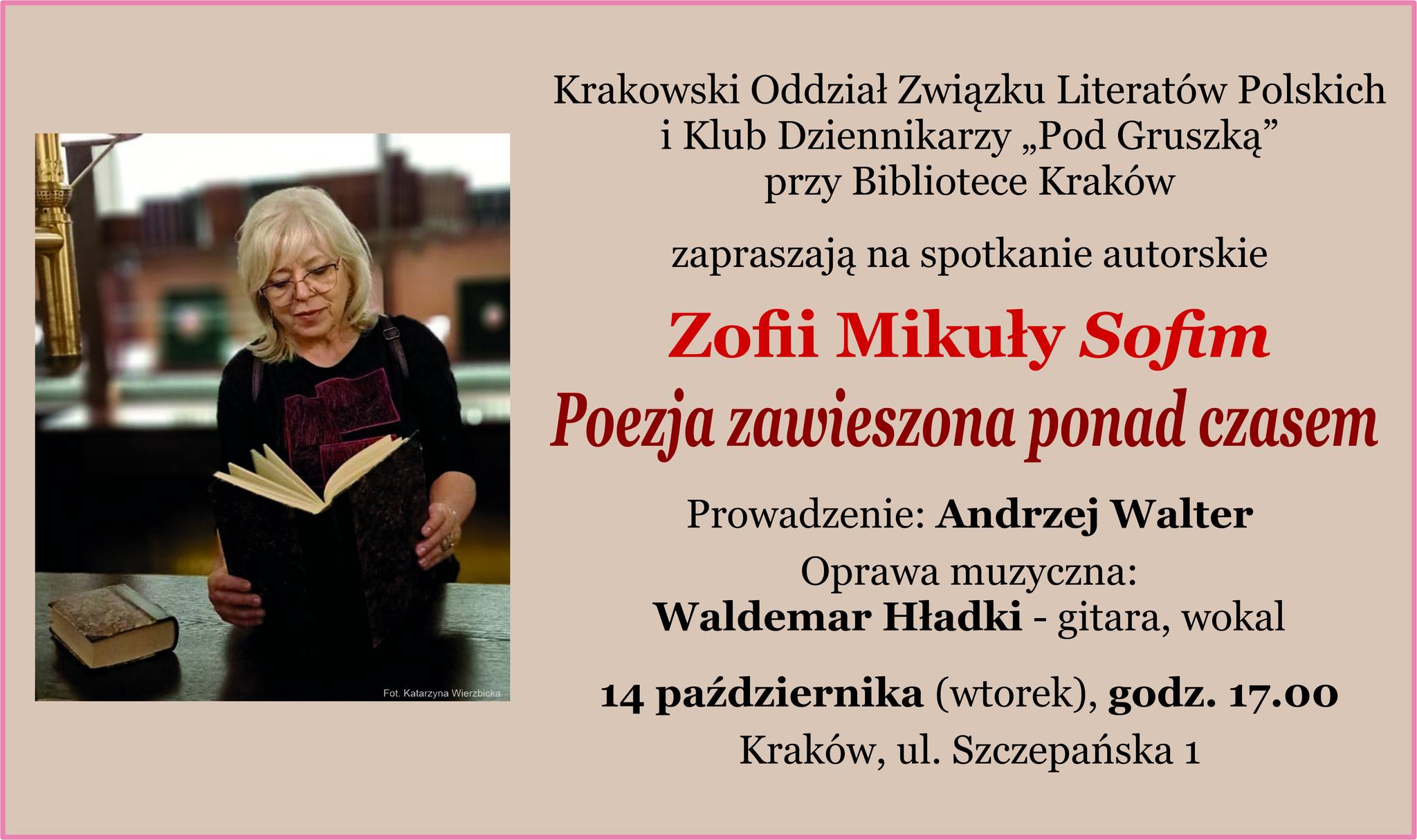 Skontaktuj się z namiBiblioteka Kraków, Krakowski Oddział Związku Literatów Polskich oraz Klub Dziennikarzy „Pod Gruszką” zapraszają na wyjątkowe spotkanie autorskie Zofii Mikuły Sofim pt. „Poezja zawieszona ponad czasem”